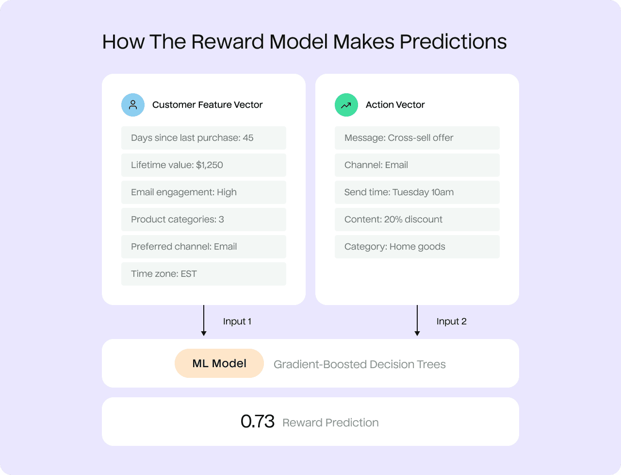 - Reward prediction: The model outputs a prediction score (e.g., 0.73) indicating how likely the action—this specific combination of dimensions—is to drive the desired outcome for this specific customer