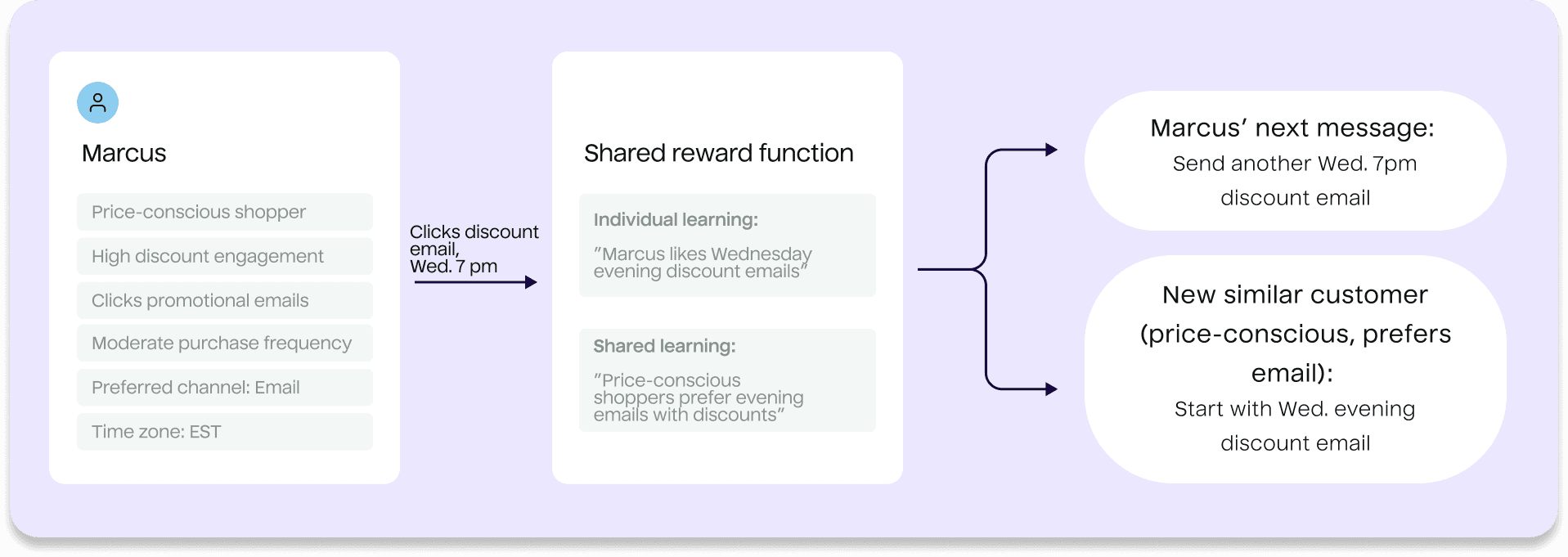 Audience-level learning: When Marcus clicks a discount email on Wednesday evening, the bandit doesn't just learn about Marcus, it updates its understanding of how similar customers (price-conscious, moderate purchase frequency, evening engagement) respond to discount offers. These audience-level patterns inform decisions for customers with similar characteristics.