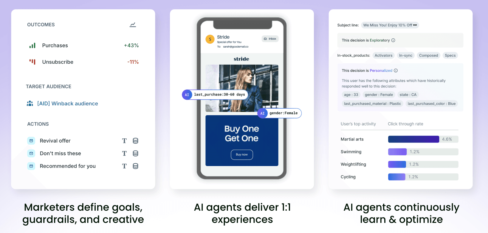 Addressing the shortcomings mentioned above can return email to its former glory. Over the past year, there has been a tidal wave of innovation around AI Decisioning. Hightouch and other vendors have found ways to harness AI agents to dynamically choose what content recipients should receive based on known customer data and reinforcement learning. Since it’s too time-consuming for humans to choose the right content, timing, subject line, and imagery for emails, AI can use pre-defined content, goals, and guardrails to test hundreds of different messages and learn what works and what doesn’t for each recipient over time.
