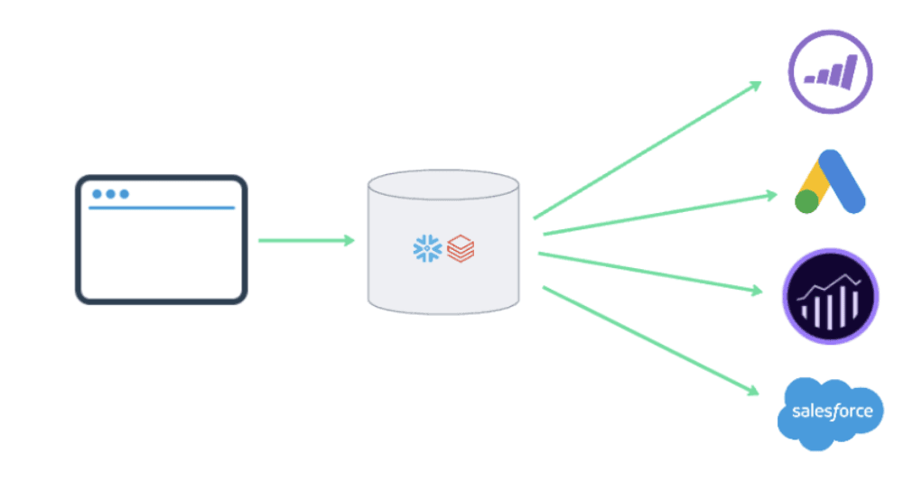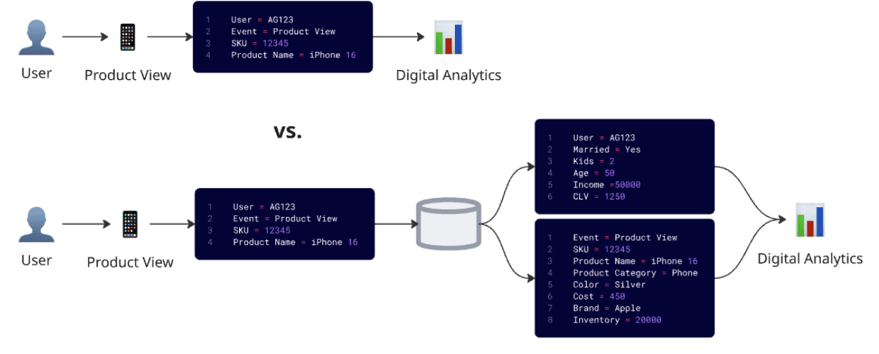 To improve this, many organizations enrich user and event data collection by enriching data through the data warehouse. When data is collected, instead of being sent directly to Adobe Analytics, it is sent to the warehouse (often Snowflake, Databricks, BigQuery, Redshift, Azure, etc.).