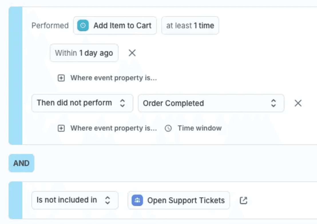 While adding additional data to Adobe Analytics to help build better segments is great, there are often cases where it may be too costly to import all of the data you need for segments into Adobe. For example, suppose your organization tracks support tickets with Zendesk. Sending all customer support ticket data to Adobe Analytics/CJA could be too expensive. But what if you need to build a segment/audience encompassing Adobe Analytics data in Adobe Analytics and Zendesk customer support data (see a more detailed example here)? Instead of sending all Zendesk customer support data to Adobe Analytics/CJA, you could build the desired segment/audience in Hightouch, which leverages all customer data (including Zendesk) in the warehouse. The segment/audience might look like this: