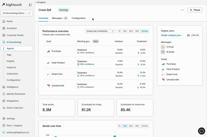 This is exactly what we've built at Hightouch with our AI Decisioning platform. Our AI Decisioning platform connects directly to your existing customer data warehouse and the marketing platforms that you already use, so you can get set up quickly, without redoing your entire marketing workflow, uploading content, or rearchitecting your tools.