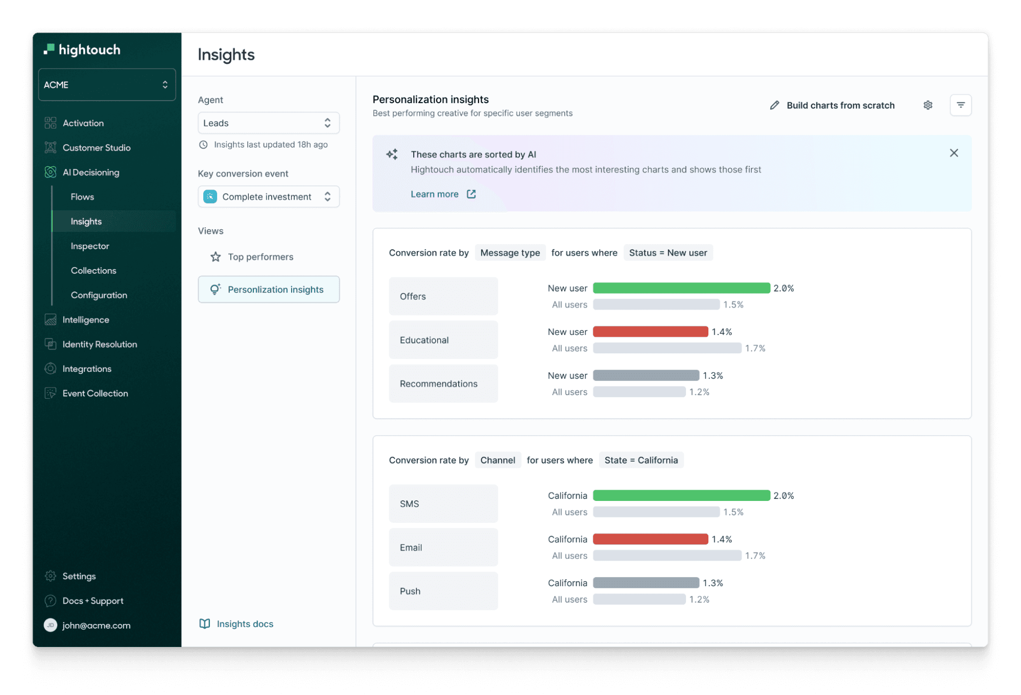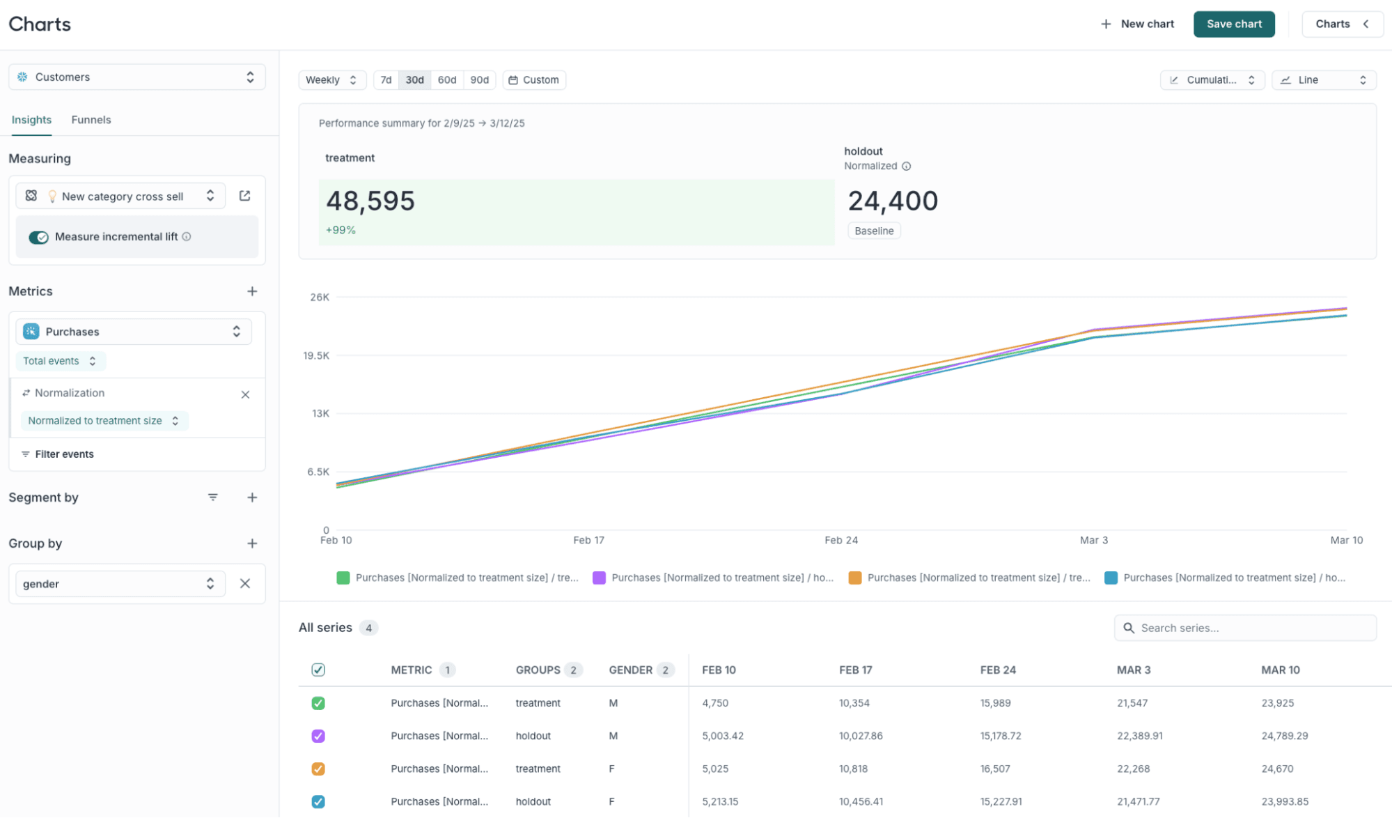 Insights builds on our existing campaign performance charts, which enable marketers to self-serve charts to understand AI Decisioning campaign performance in relation to holdout groups. Marketers can segment and group performance data by any available customer data properties. When you’ve built the chart you need—or that helps you understand overall performance for a segment identified by Insights—save it for regular use.
