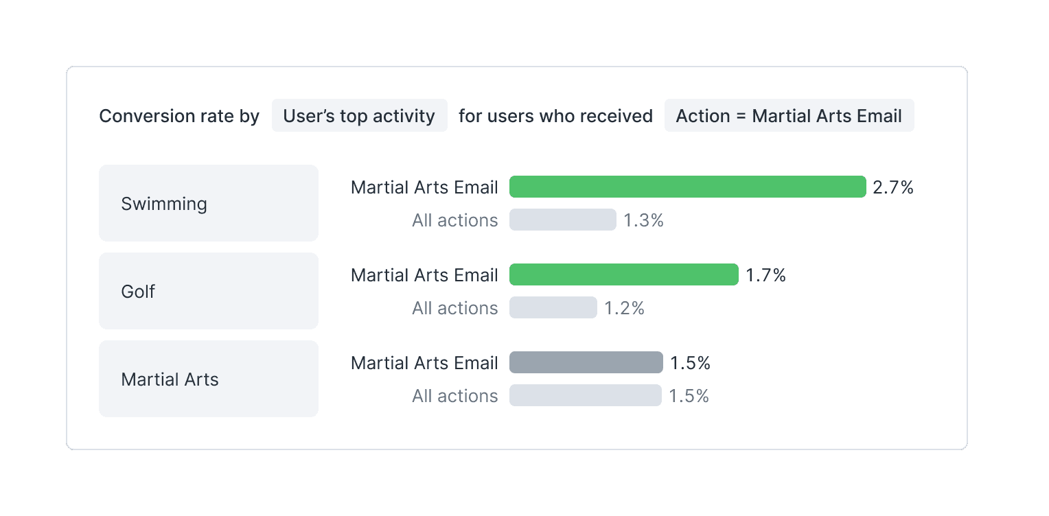 As AI Decisioning tested a range of activity-oriented messages, it uncovered unexpected results. For example, users whose top activity was swimming clicked through on martial arts content at a higher rate than even users who listed martial arts as their top activity.