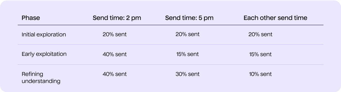 - The bandit shifts send volume so that 40% of sends use 2 pm, with 15% to each other time