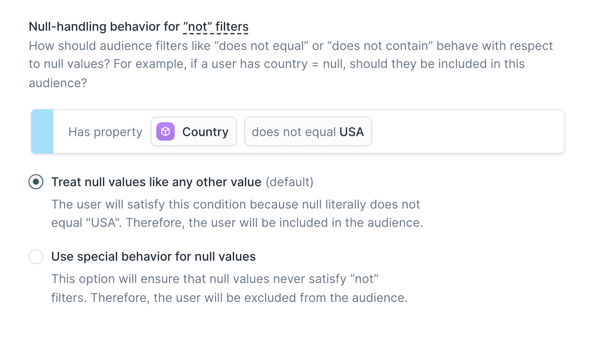 Our new null handling behavior includes records with null values by default when using negative filters. With the example above, customers with null ‘country’ values would now be included in the “customers not in the United States” audience.