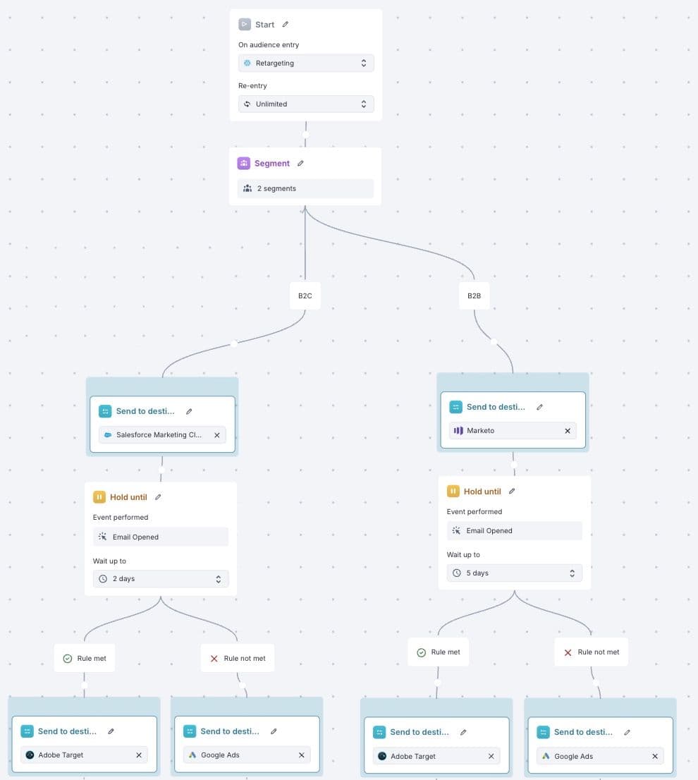 Furthermore, building this journey from Hightouch means you can use any customer touchpoint in the data warehouse to inform logic and decisions. In contrast, if you were building a journey in Salesforce or Adobe, you’d be limited to data within that suite.