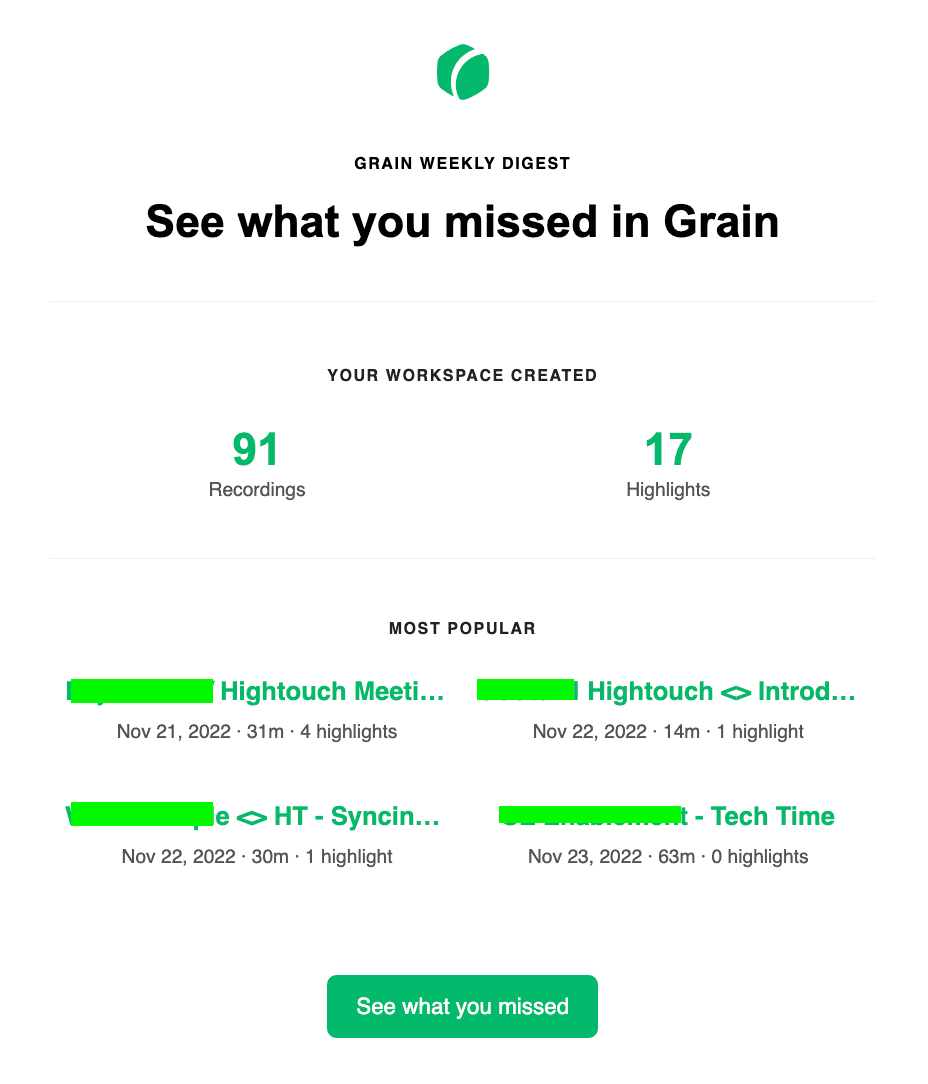 Another excellent example of a product utilization campaign is from our friends Grain - a leading meeting insights tool. Grain sends a weekly digest with stats about your workspace usage and the most popular meeting recordings from that week. The insights help us here at Hightouch to quickly access any popular recordings while letting us track our recording utilization.
