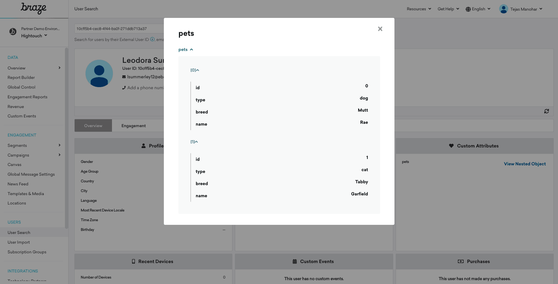 We can head into Braze and see the results of our actions. We can see the pet data under custom attributes if we search for a user.