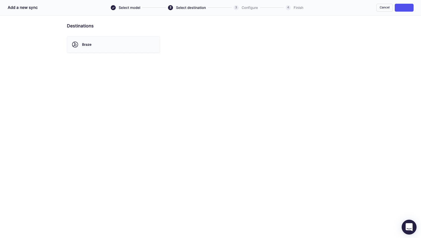 With the model created, it's time to create your sync to Braze. Select Syncs, click Add a sync, select your Braze destination and click Continue.