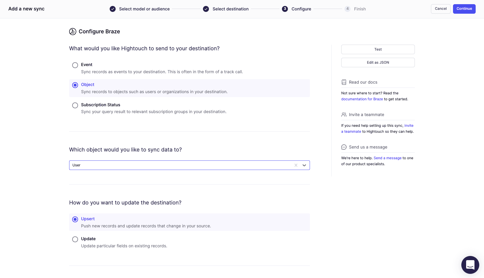 Next, configure your settings and choose how you want your data synced to Braze. You'll also need to choose an object and define how your records should be updated. After this, you simply need to select a primary key and choose which columns you want to sync to Braze.