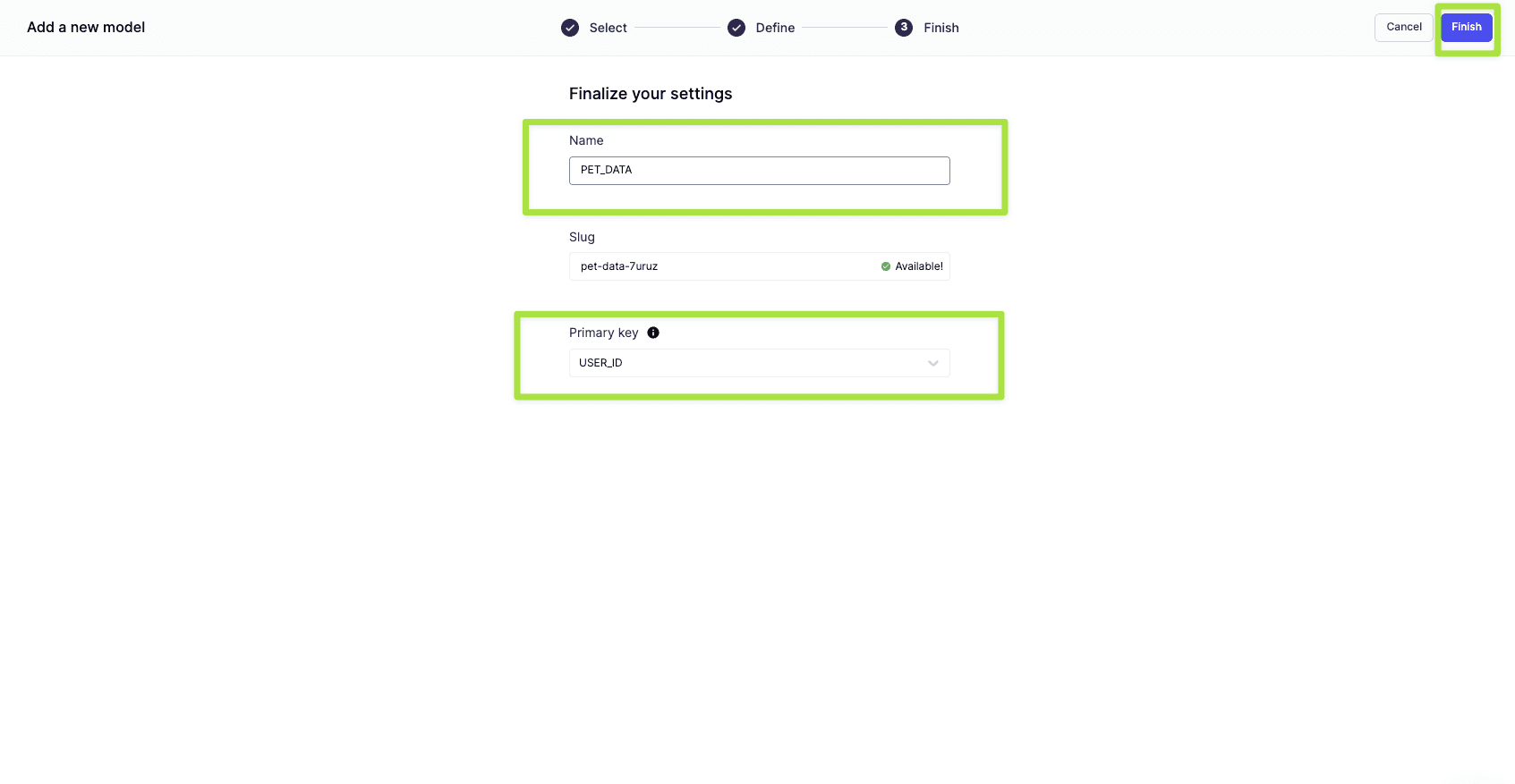 Click Preview and verify your model output looks correct. Name your model, select your primary key, and click Finish.