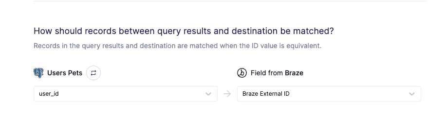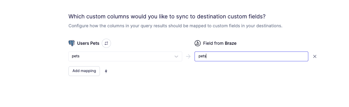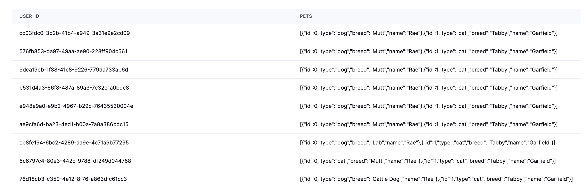 Note: before you can sync your data to Braze destination you'll want to make sure it's modeled properly. Taking the example of a customer who has multiple pets, you’ll want to build a single column (within your data model) that contains the entire nested object array containing pets and their metadata. Here’s an example JSON body:
